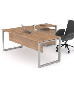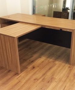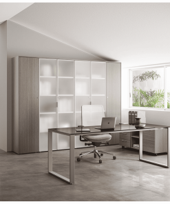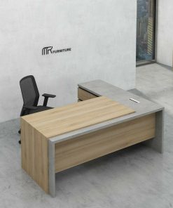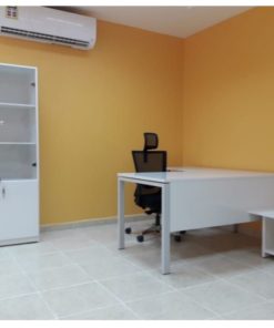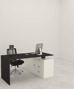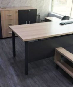 مكتب إداري كحلي وخشبي بتصميم هندسي أنيق مع وحدة تخزين وطاولة ضيافة